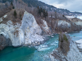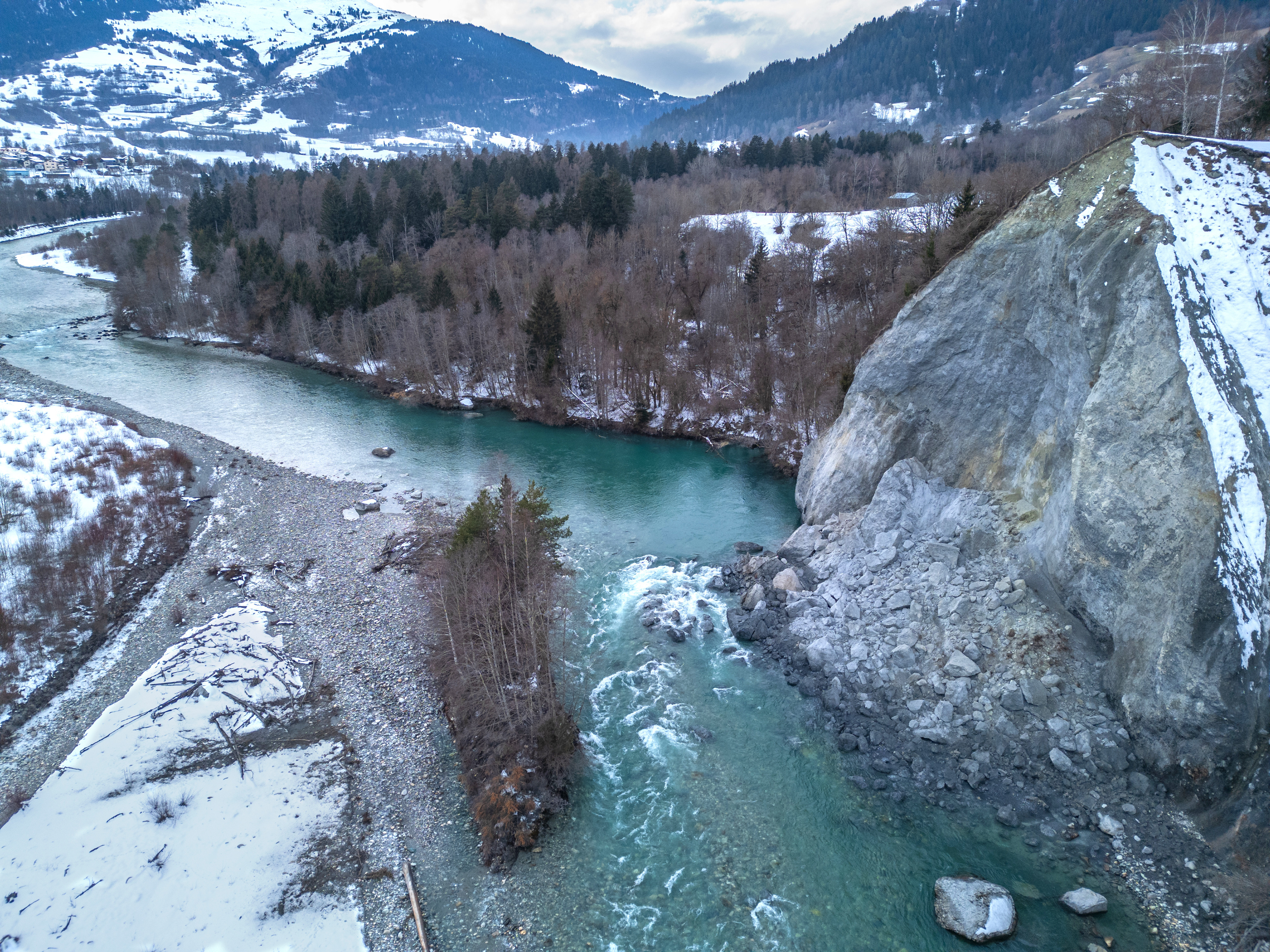 Felssturz am Vorderrhein auf der Höhe von Schluein, via a vis der Castrischer Auen, auf der linken Flussseite bei der ersten Felswand vor der Rheinschlucht